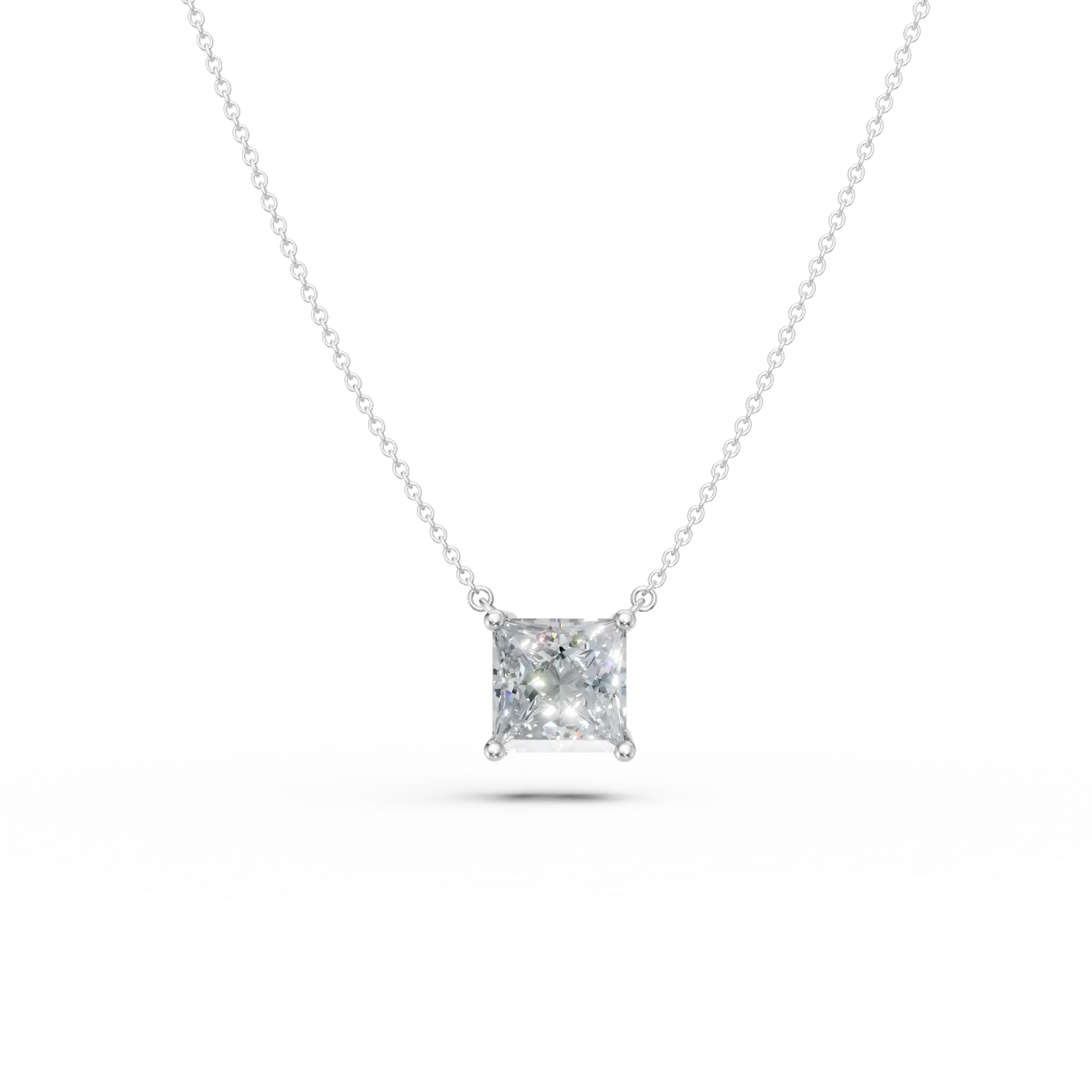 Lant cu pandantiv din aur alb cu diamant princess solitaire de 1ct creat in laborator