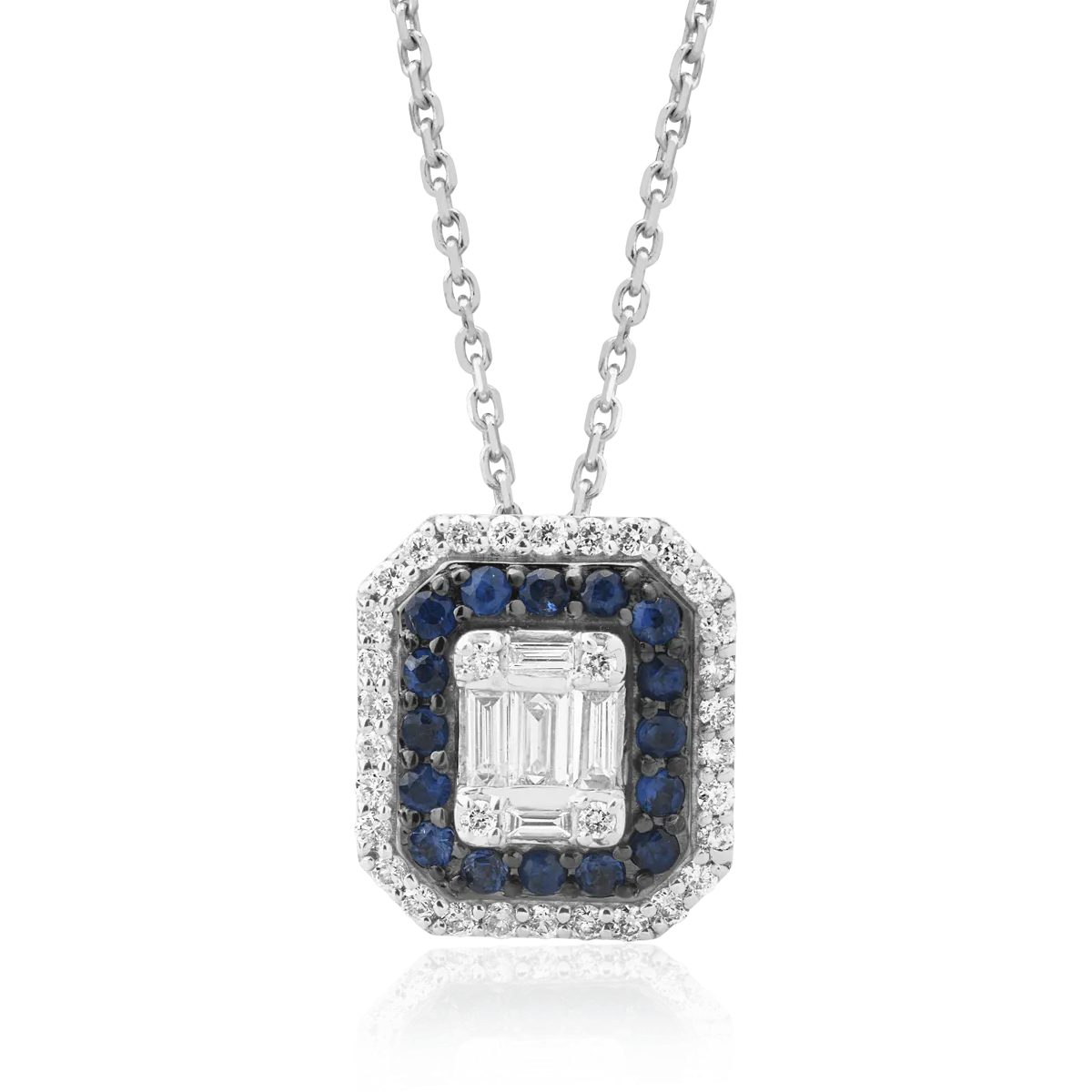 Lant cu pandantiv din aur alb cu diamante baguette si rotunde de 0.74ct si safire de 0.222ct