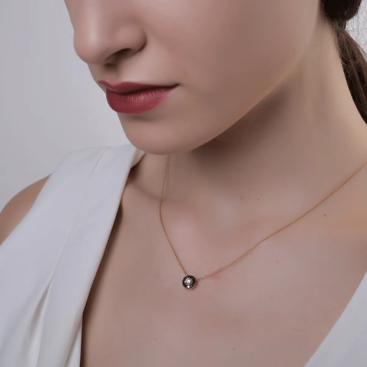 O tinuta eleganta si un mod de a o accesoriza ce intoarce privirile. Acest lant cu pandantiv din aur roz cu diamant transparent de 0.17ct si diamante negre de 0.22ct imbina perfect contrastul dintre lumina si mister. Finisajul metalului evidentiaza stralucirea pietrelor, iar designul sau echilibrat transmite rafinament si forta interioara. Este bijuteria care iti completeaza stilul cu o nota distincta, potrivita oricarei ocazii. Lasa detaliile sa spuna povestea ta si poarta aceasta piesa ca pe o semnatura de eleganta si atitudine. Fii de neoprit cu bijuteriile TEILOR!
