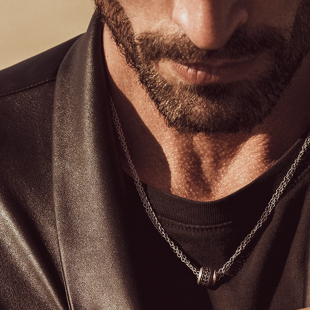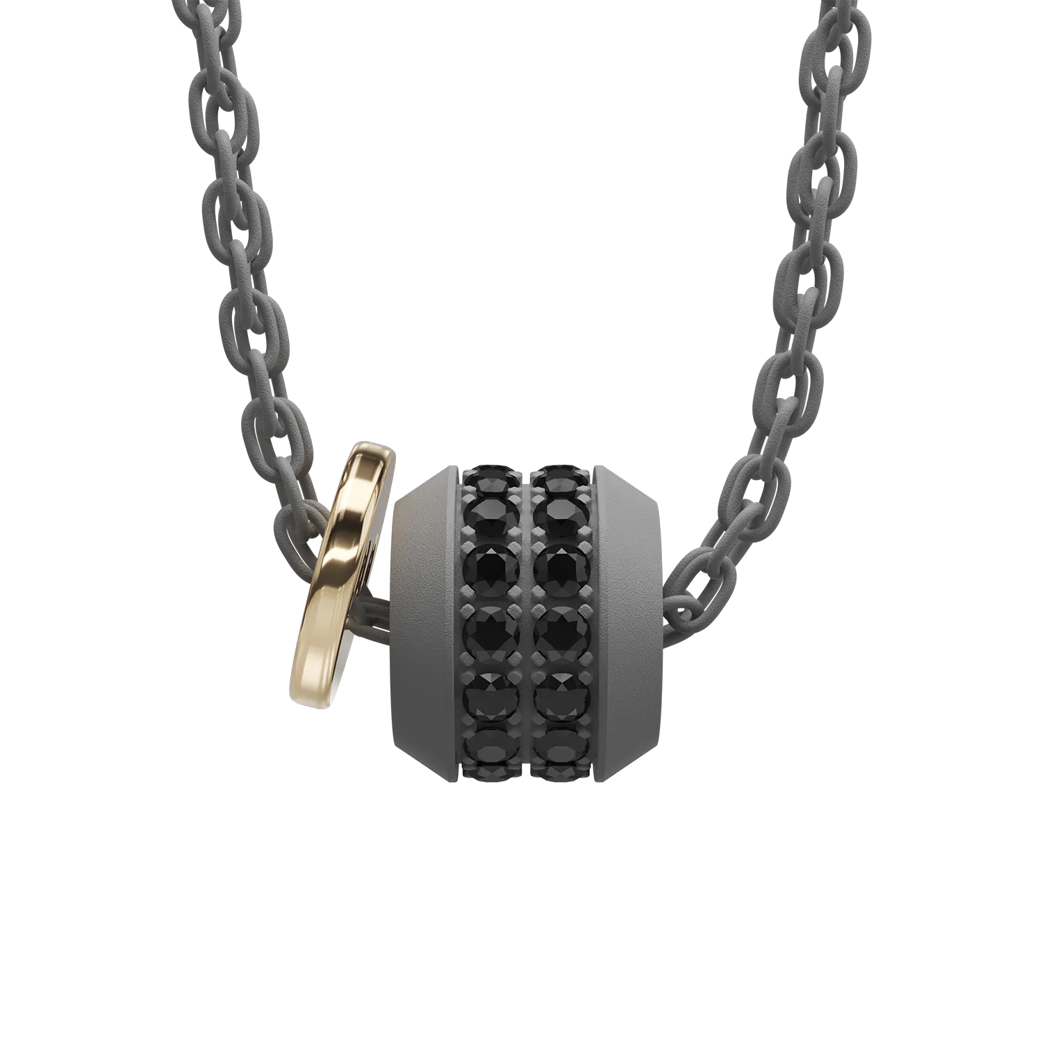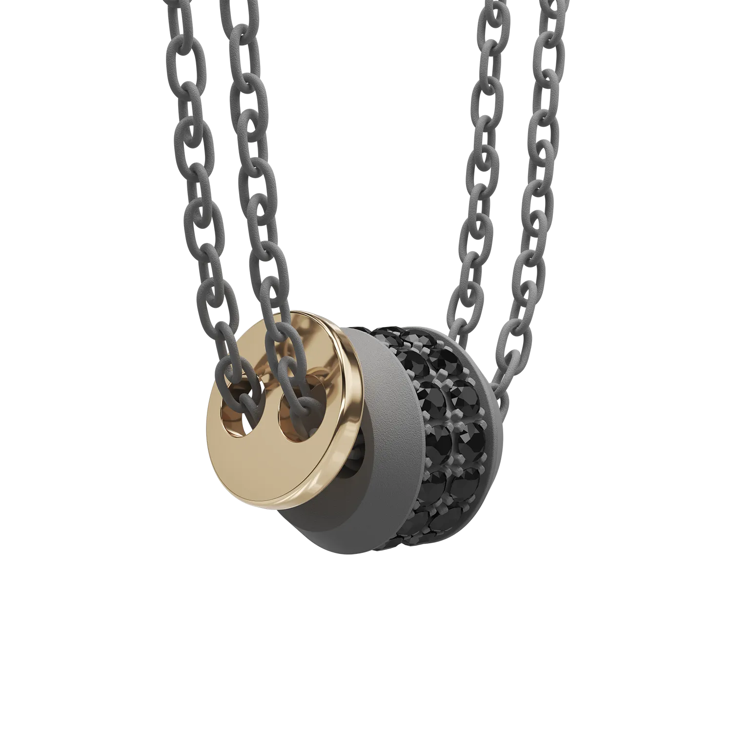 Detalii neasteptate, elemente neconventionale care, aduse impreuna, creeaza o colectie statement pentru barbati. Lantul dublu, pandantivul circular incrustat cu diamante negre si cel din aur galben, compun o bijuterie versatila, contemporana, potrivita celor care arata incredere fara efort.