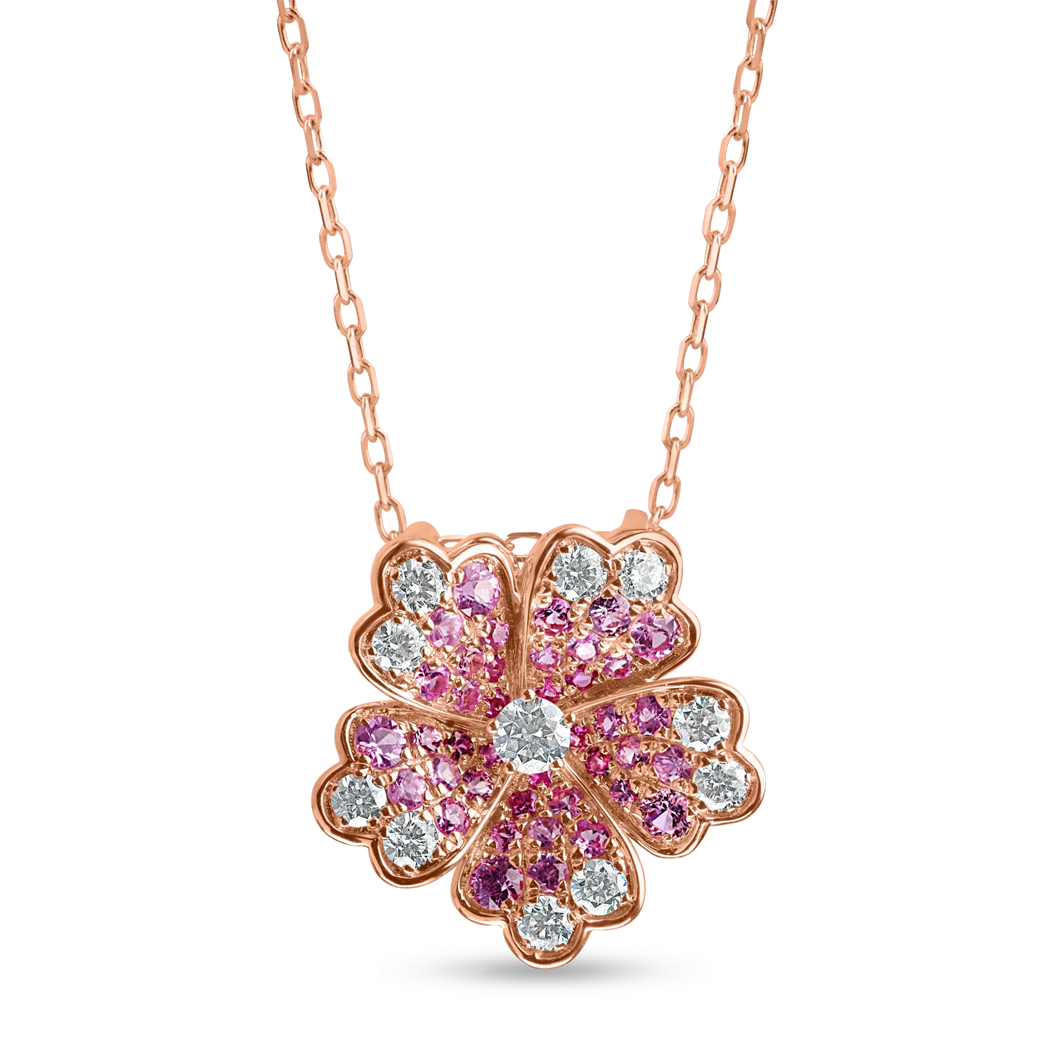 Lant cu pandantiv floare din aur roz cu diamante de 0.4ct si safire roz de 0.6ct