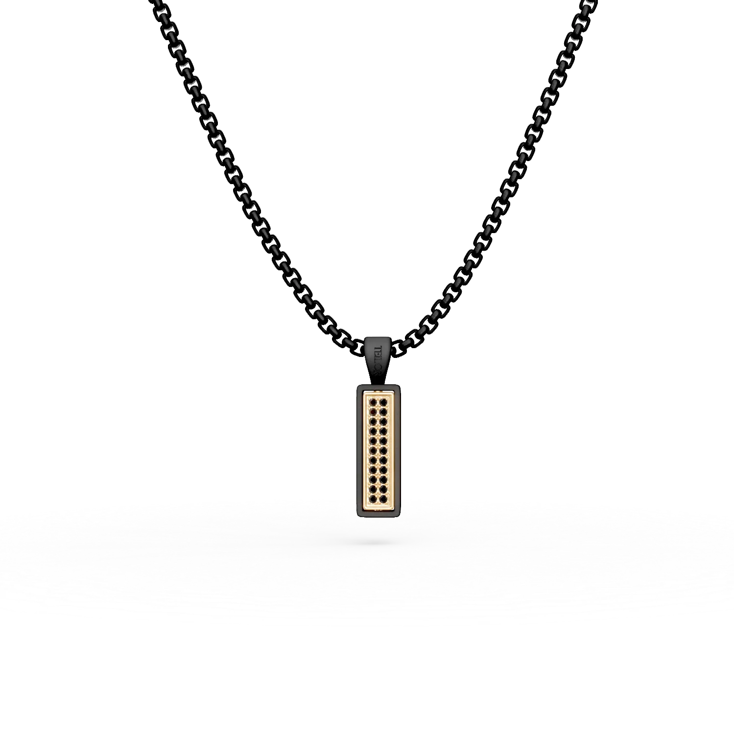 Definit de contraste subtile, lantul cu pandantiv Gravity imbina titanul cu aurul galben intr-un design modern si versatil. Elementul rotativ dezvaluie diamante negre de 0.1ct si lapis lazuli de 0.9ct – simbol al echilibrului dintre forta si calmul interior.