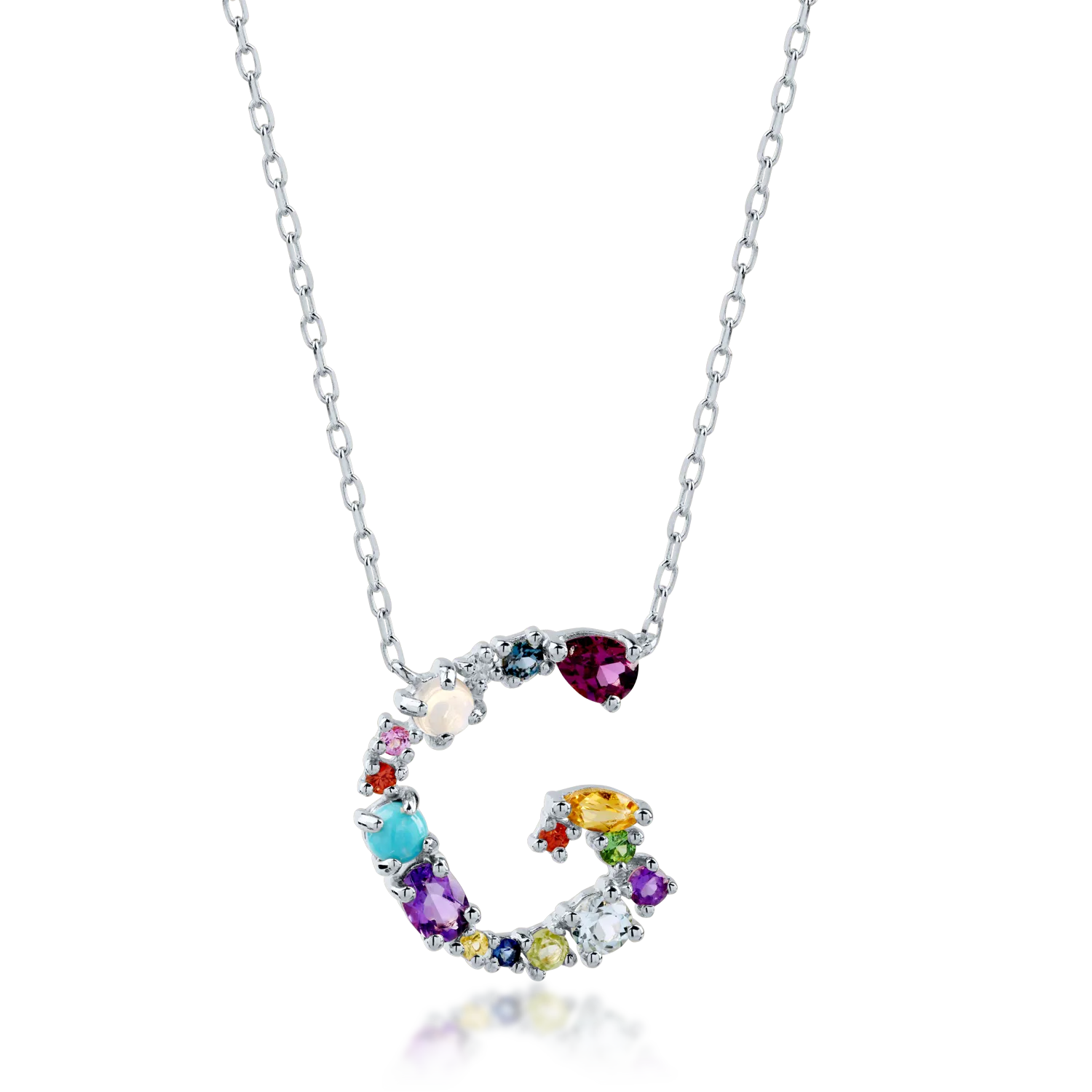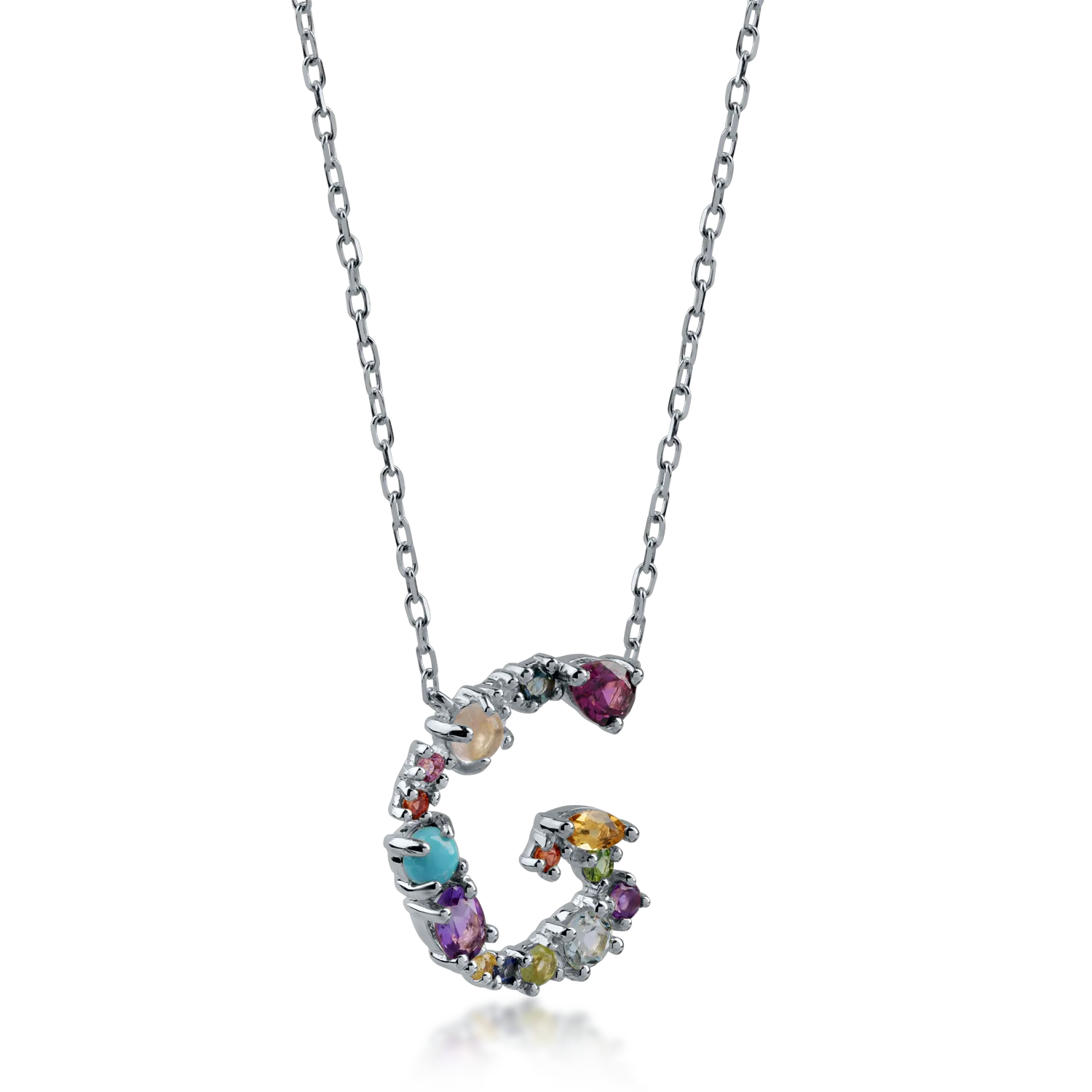 Lantul cu pandantiv initiala G din aur alb este o piesa moderna si rafinata, creata pentru a celebra stilul tau unic. Designul inedit al pandantivului este completat de un mix elegant de pietre pretioase si semipretioase, cu un carataj de 1.1ct, dispuse armonios pentru a oferi stralucire si contrast. Aurul alb adauga un plus de rafinament, punand in valoare cromatica vibranta a pietrelor. O bijuterie expresiva, ideala pentru a fi purtata zilnic sau oferita in dar cu semnificatie. Descopera aceasta creatie in universul TEILOR si poarta cu tine o declaratie de stil.