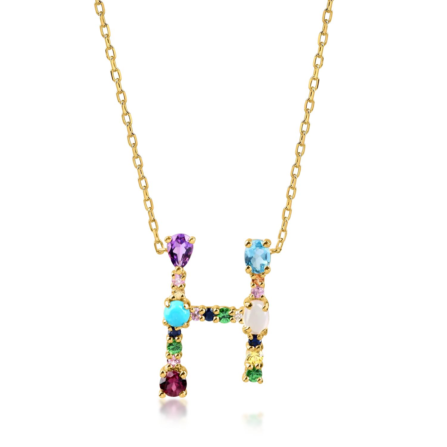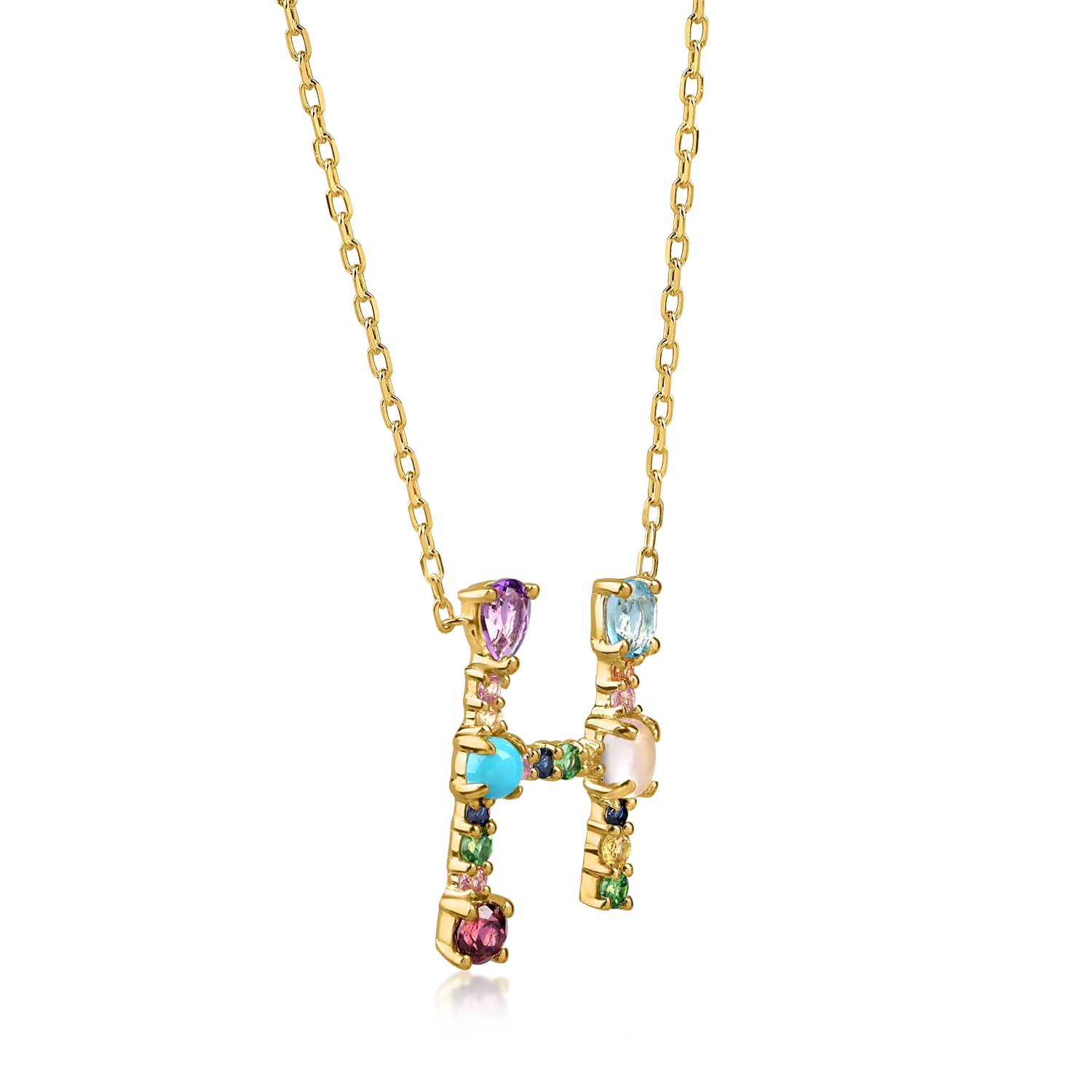 Lant cu pandantiv initiala H din aur galben cu pietre pretioase si semipretioase de 0.9ct