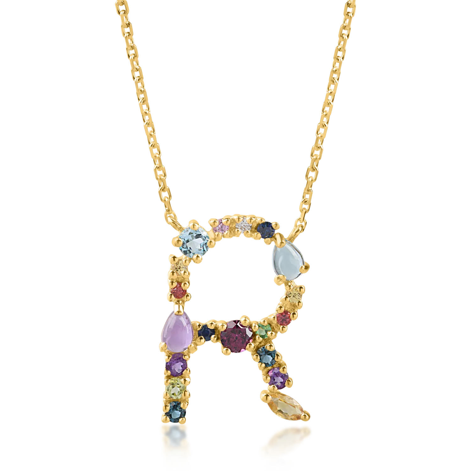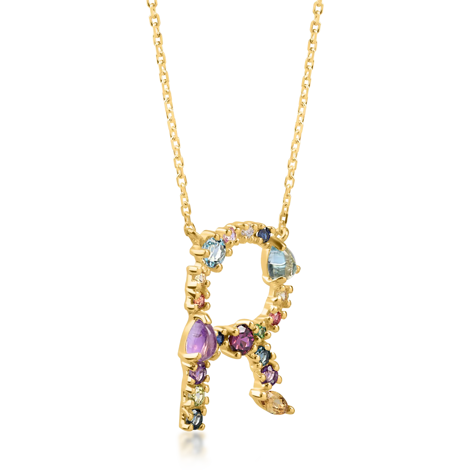 Lant cu pandantiv initiala R din aur galben cu pietre pretioase si semipretioase de 1.2ct