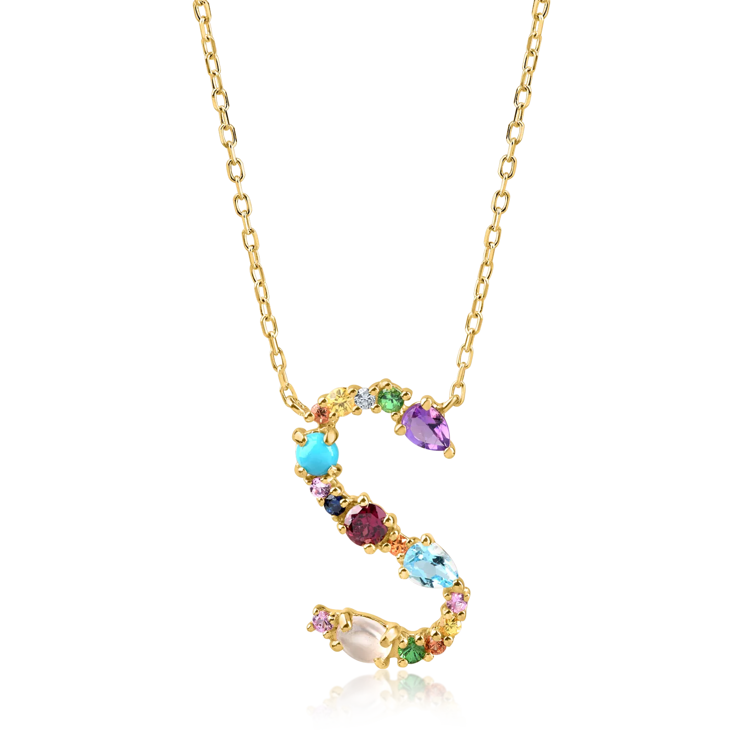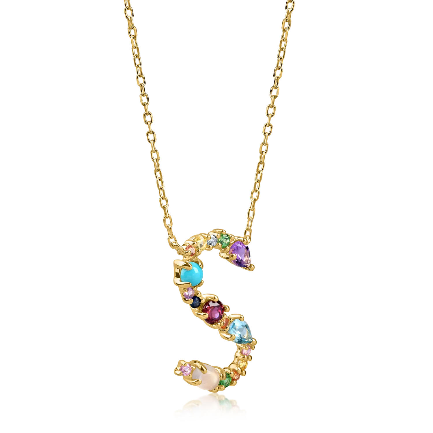 Lant cu pandantiv initiala S din aur galben cu pietre pretioase si semipretioase de 1.1ct