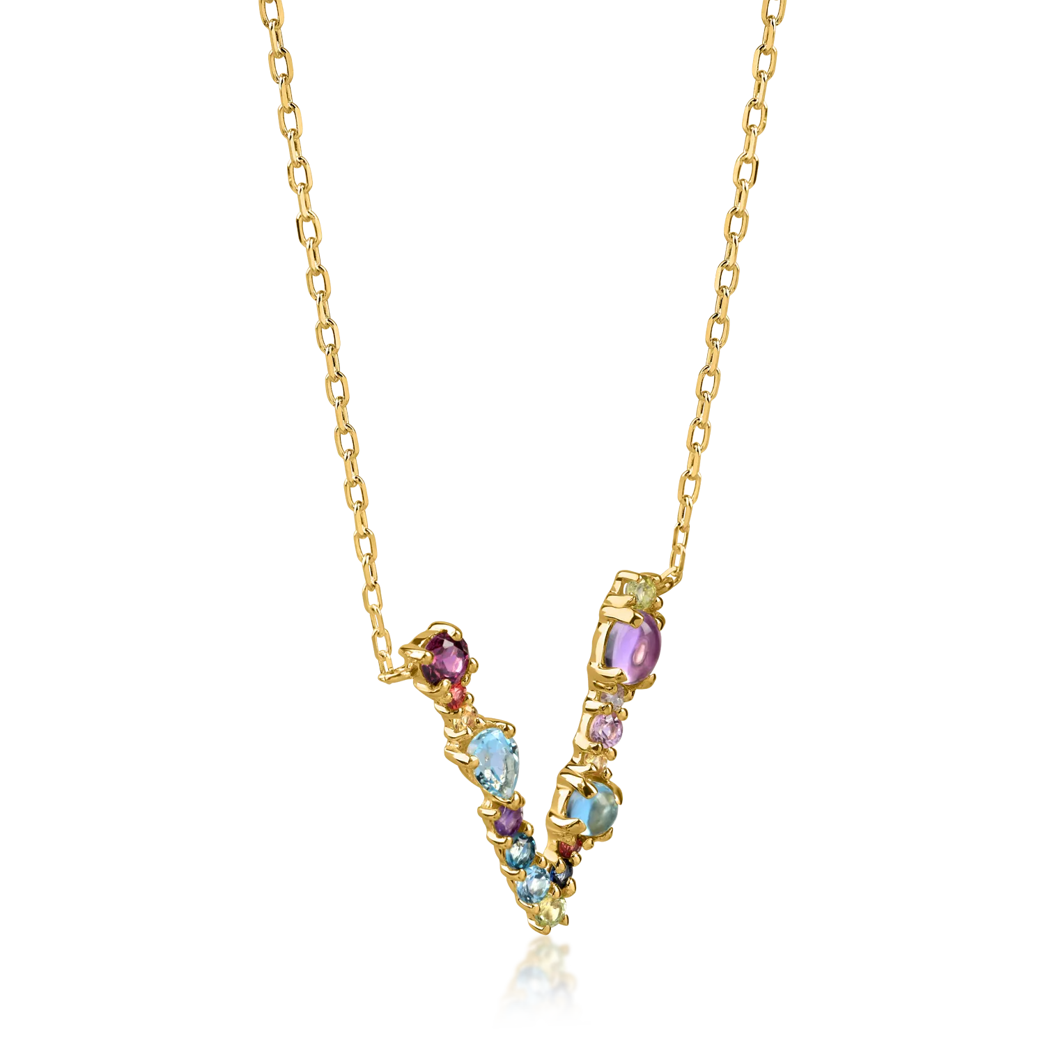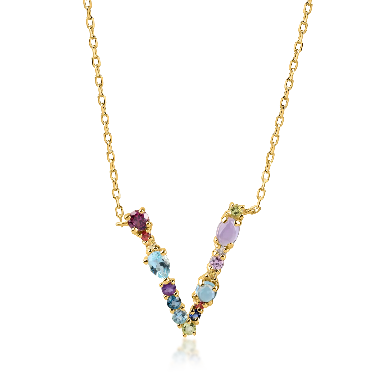 Lant cu pandantiv initiala V din aur galben cu pietre pretioase si semipretioase de 1.1ct