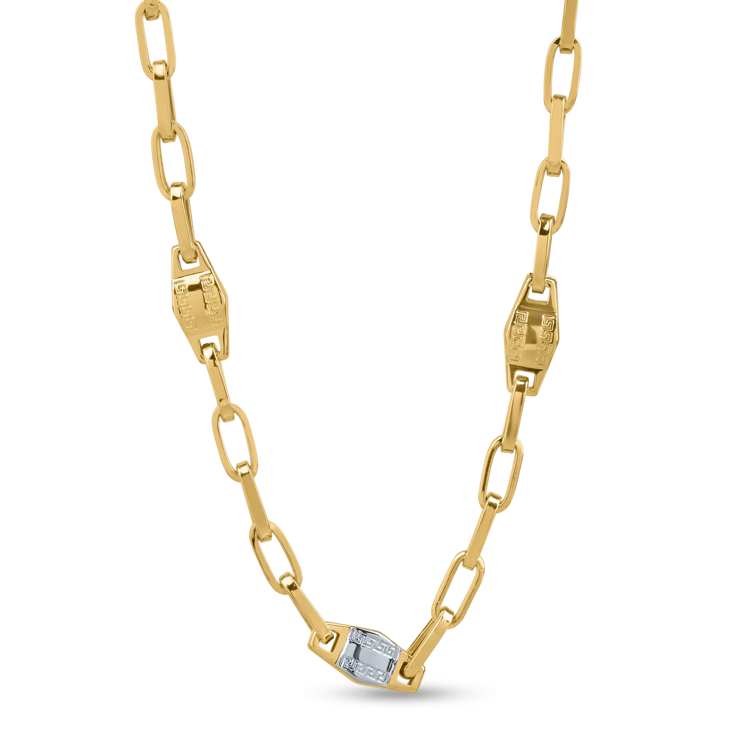 Eleganta este un stil de viata. Realizat pentru cei care isi seteaza mereu noi provocari, lantul din aur alb-galben pentru barbati se remarca prin complexitatea designului si finisajul metalului lucios. O alegere ideala pentru cei care doresc sa-si depaseasca limitele.