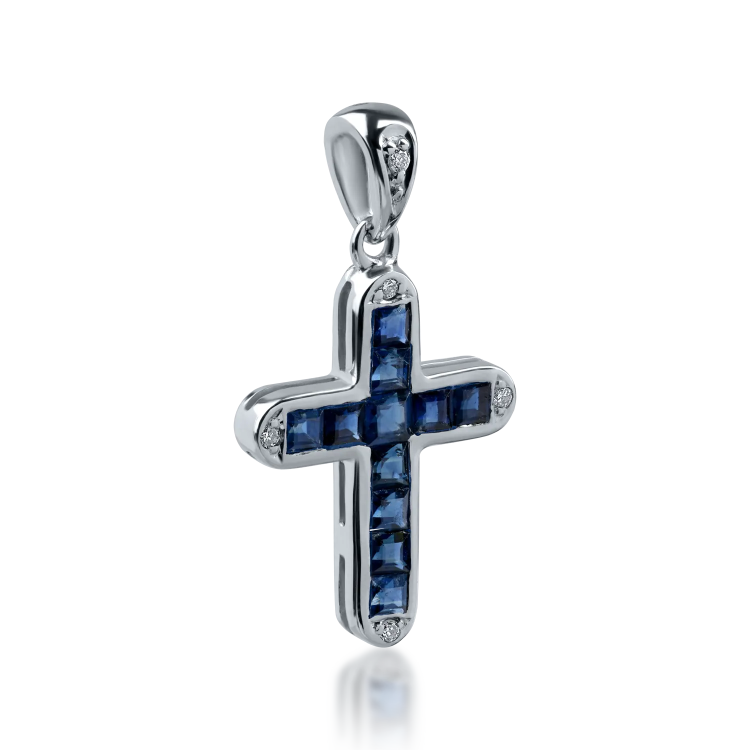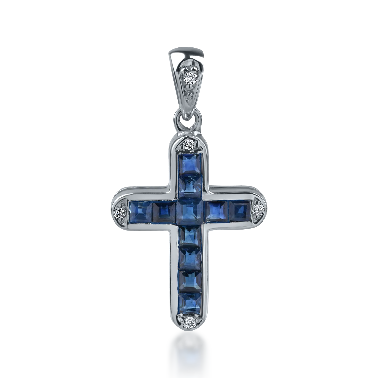Pandantiv cruce din aur alb cu safire rectangulare de 0.6ct si diamante de 0.03ct