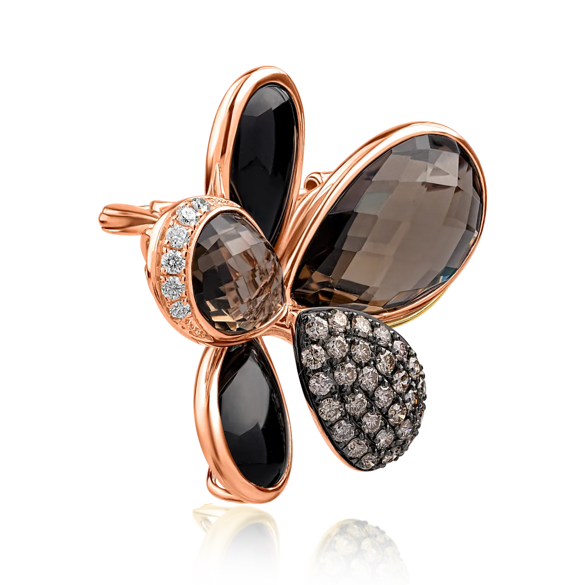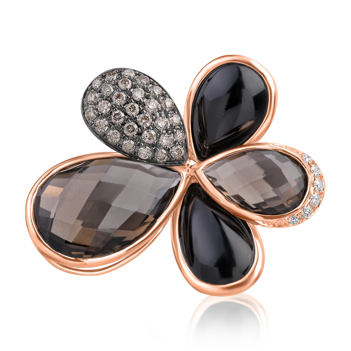 Fiecare detaliu al unei bijuterii creeaza un nou prilej de a te face remarcata prin rafinament si atitudine. Acest pandantiv din aur roz cu pietre pretioase si semipretioase de 20.98ct surprinde prin contrastul armonios dintre nuante si forme. Cuartul fumuriu pear si onyxul negru pear se completeaza perfect, emanand mister si eleganta, in timp ce diamantele ciocolatii si incolore adauga profunzime si lumina intregii compozitii. Designul clasic, dar expresiv, face din aceasta piesa o alegere ideala pentru orice ocazie. TEILOR te transpune intr-o lume a descoperirii de sine ce te va fascina!